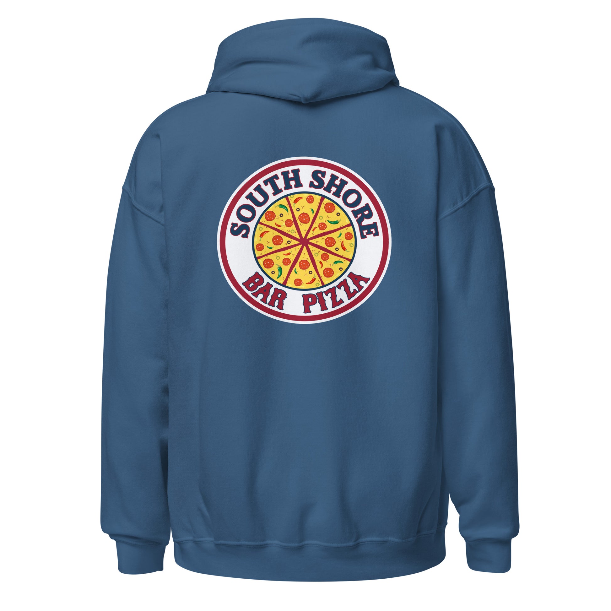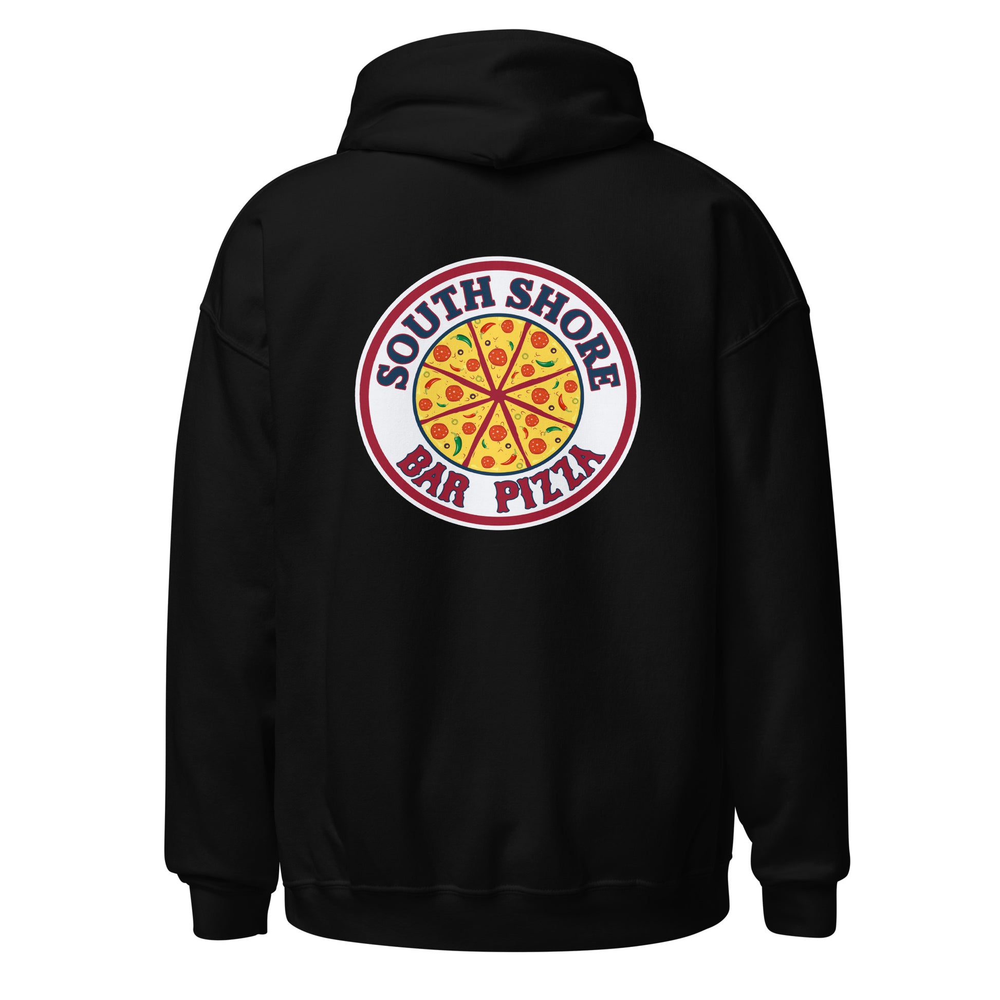 Large front pocket fits an entire bar pizza when folded in half. Two sided design, large South Shore Bar Pizza logo on back.